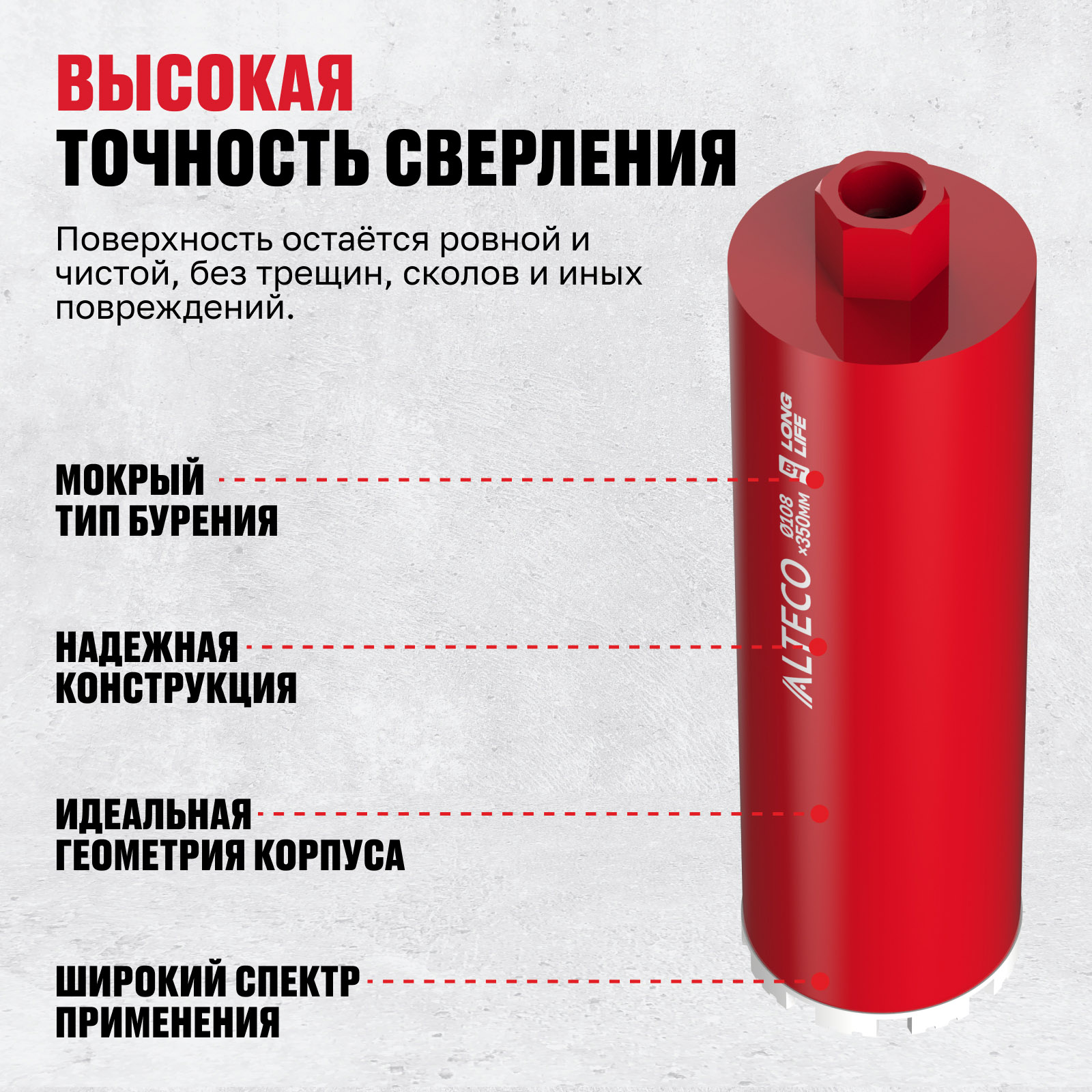 - Высокая точность сверления — поверхность остаётся ровной и чистой, без трещин, сколов и иных повреждений.