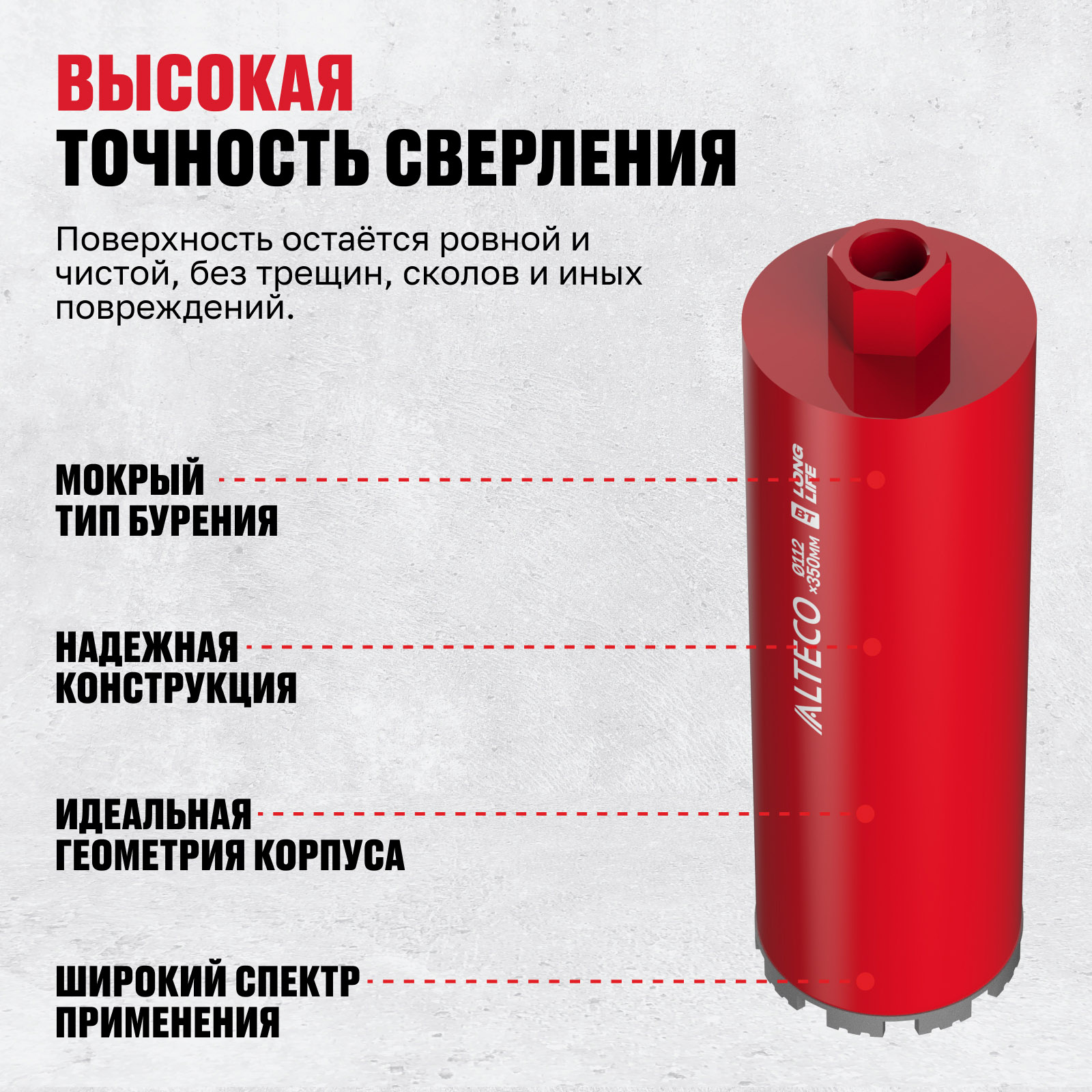 - Высокая точность сверления — поверхность остаётся ровной и чистой, без трещин, сколов и иных повреждений.