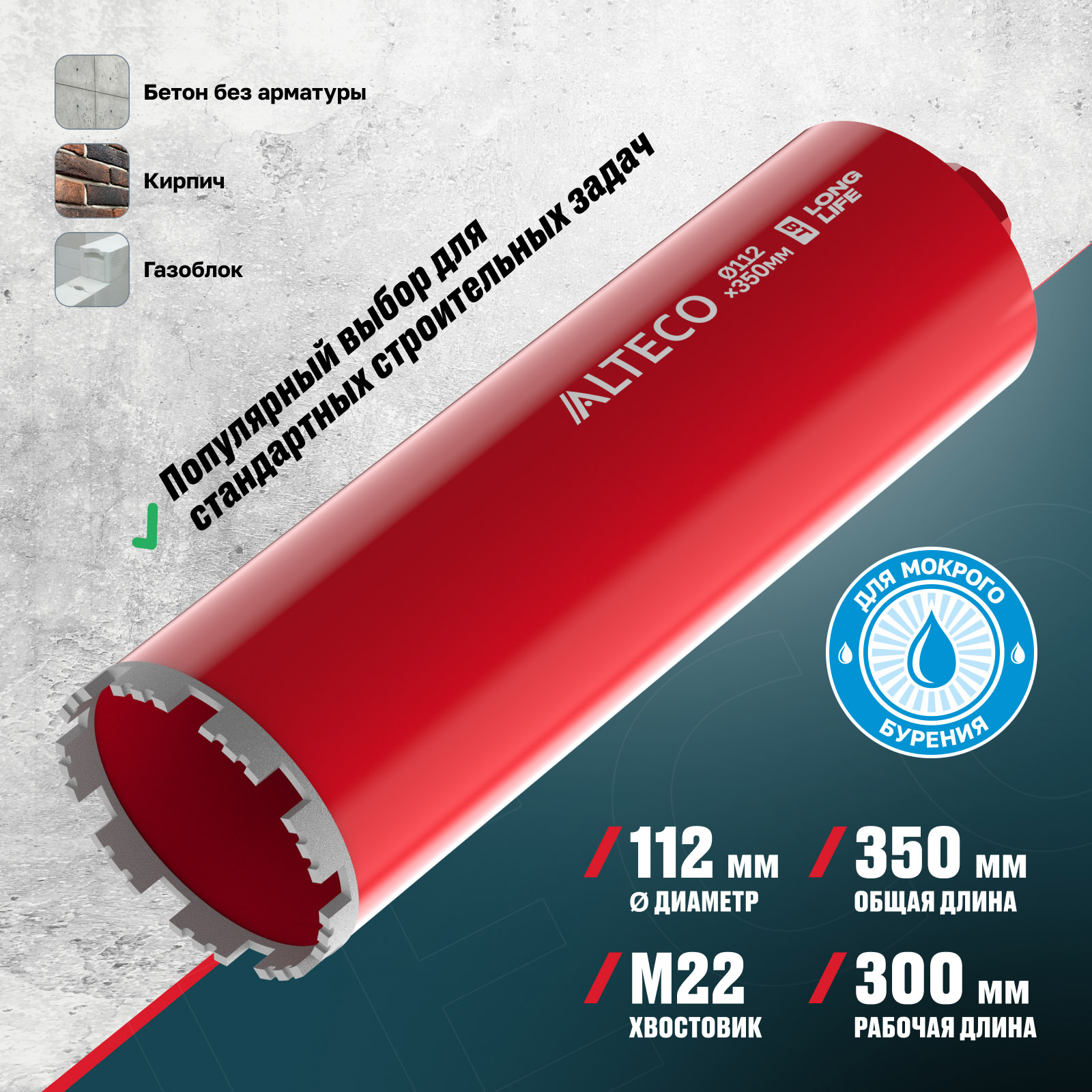 - Мокрый тип бурения — предотвращает перегрев и продлевает срок службы коронки.