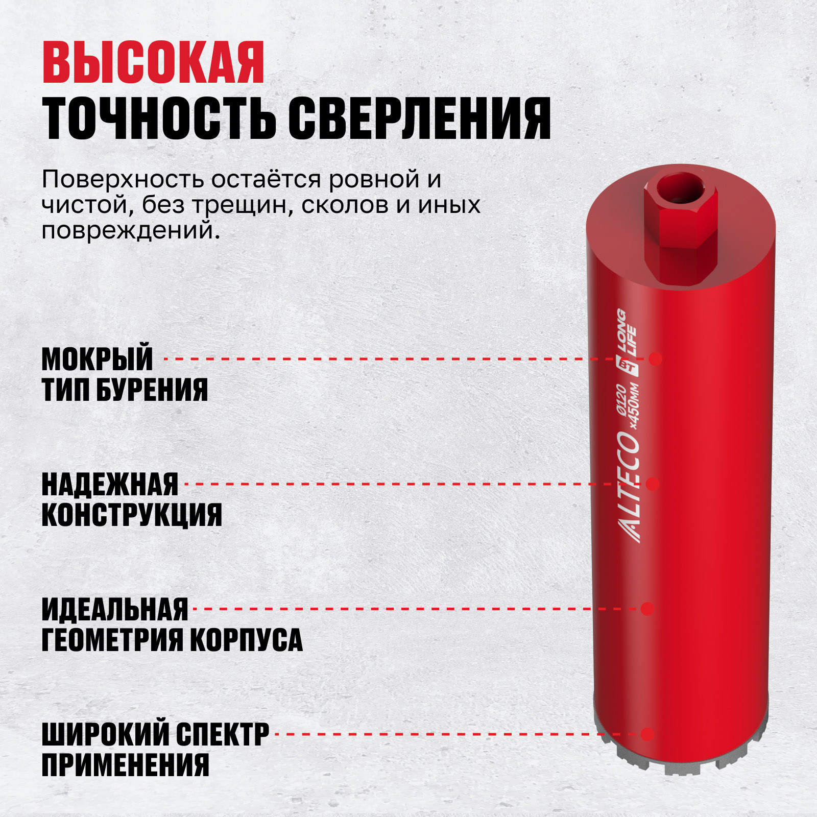 - Высокая точность сверления — поверхность остаётся ровной и чистой, без трещин, сколов и иных повреждений.