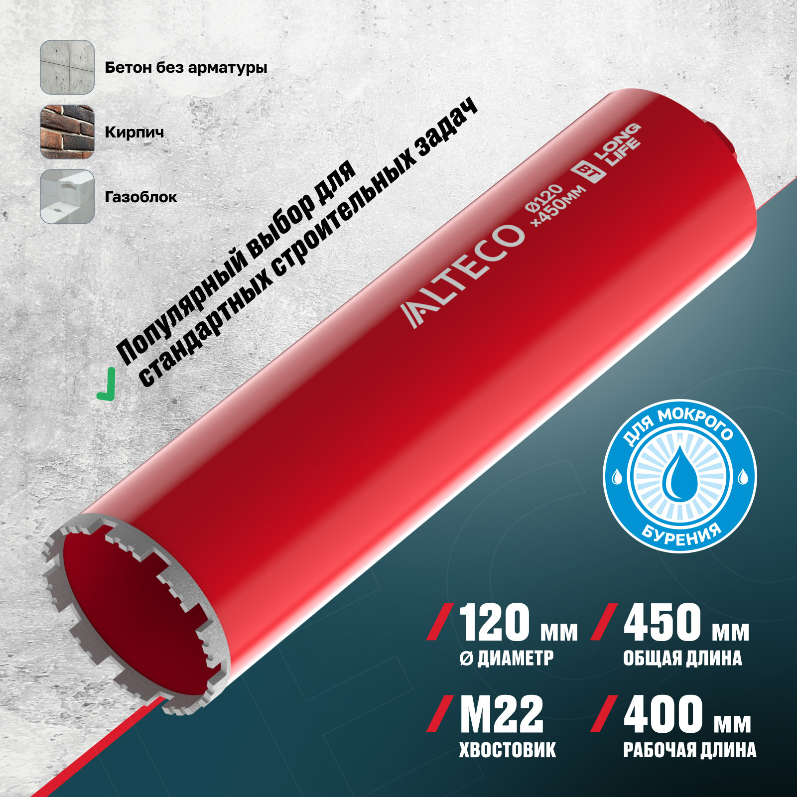 - Мокрый тип бурения — предотвращает перегрев и продлевает срок службы коронки.