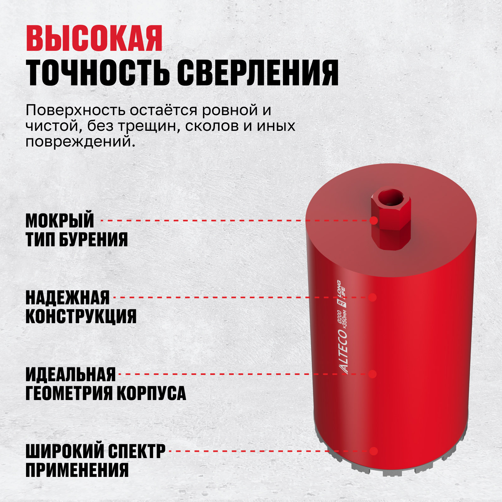 ⚠️ Важно: Данная коронка не предназначена для сухого бурения. Используйте охлаждение водой для продления срока службы инструмента и коронки. Не предназначена для работы с инструментом с микроударом.
