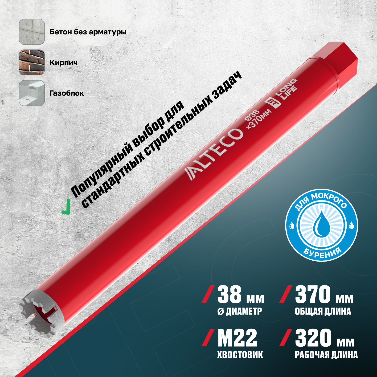⚠️ Важно: Данная коронка не предназначена для сухого бурения. Используйте охлаждение водой для продления срока службы инструмента и коронки. Не предназначена для работы с инструментом с микроударом.