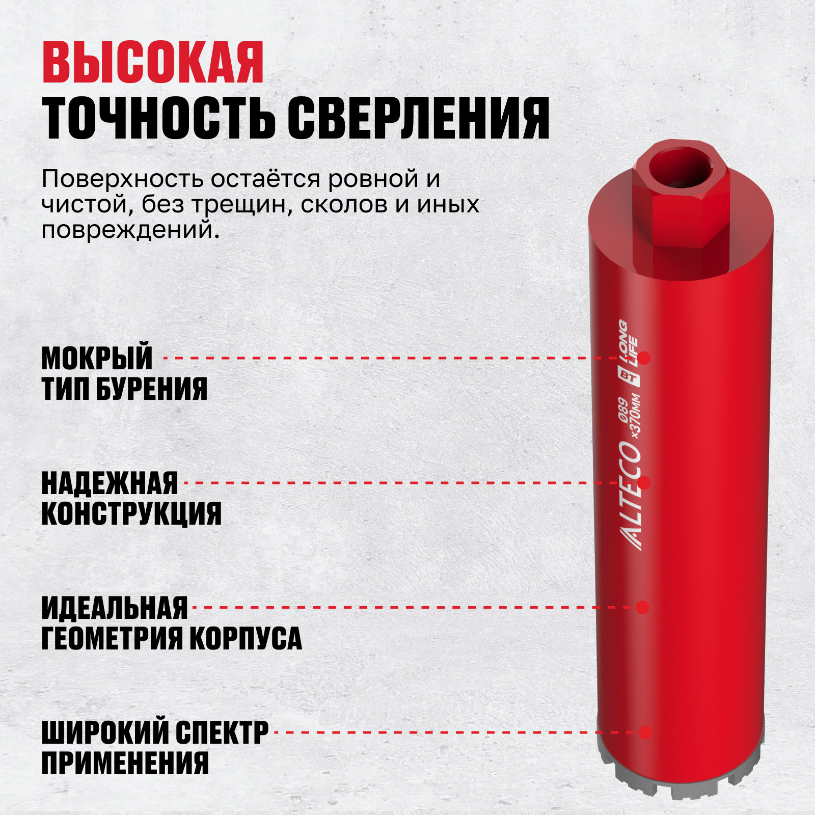 - Высокая точность сверления — поверхность остаётся ровной и чистой, без трещин, сколов и иных повреждений.