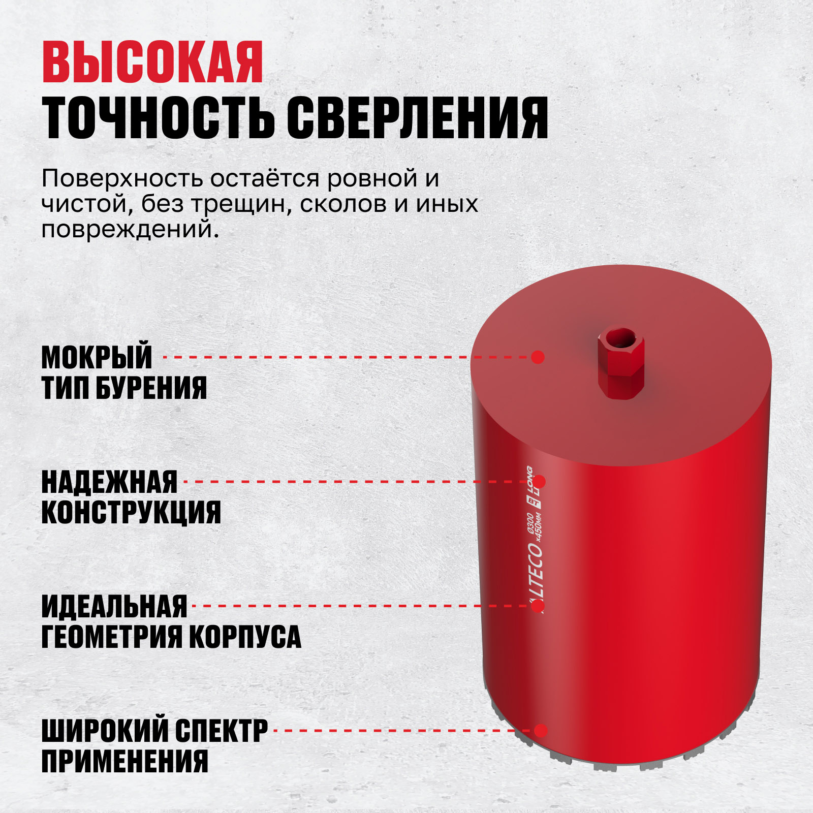 - Высокая точность сверления — поверхность остаётся ровной и чистой, без трещин, сколов и иных повреждений.