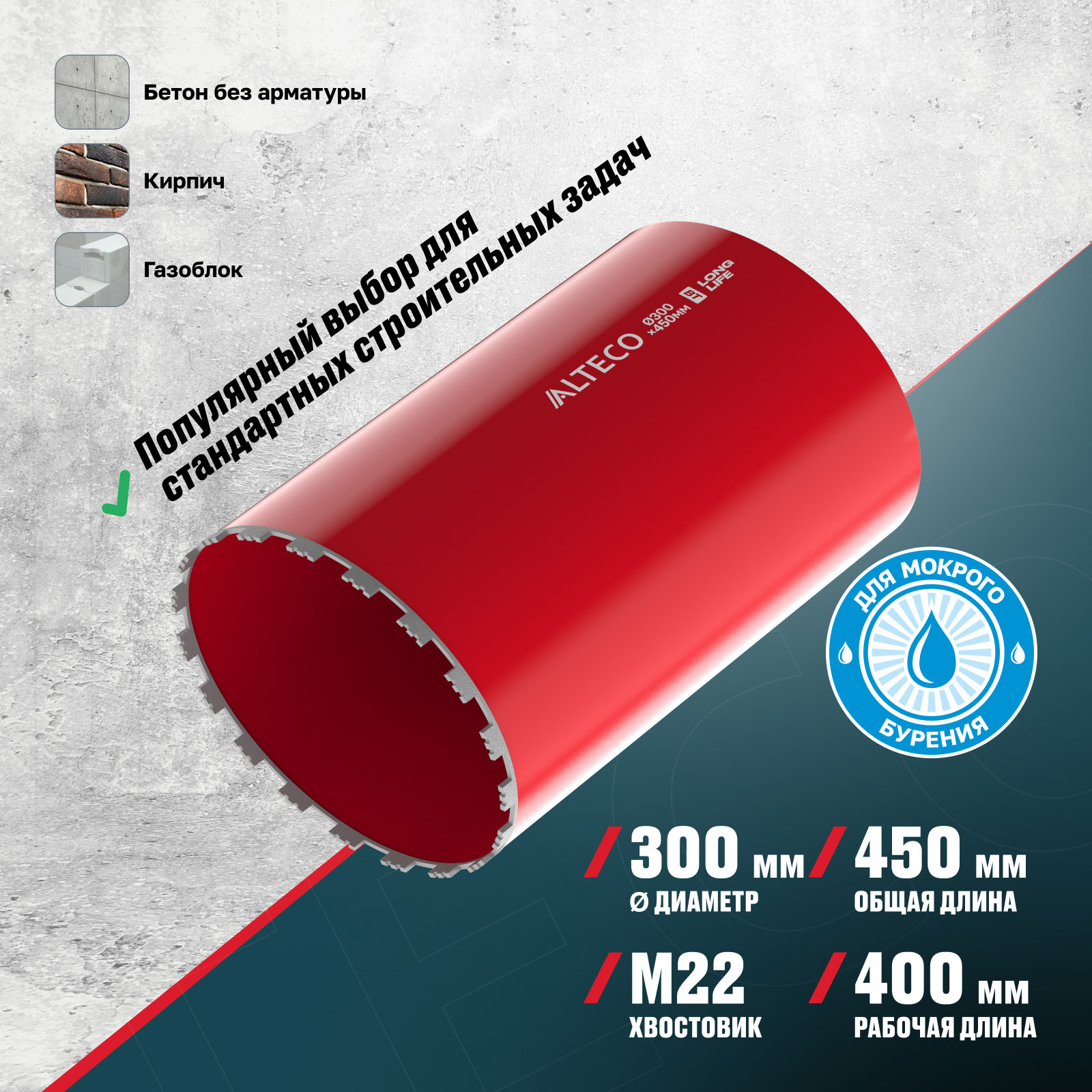 - Глубина сверления до 400 мм — позволяет проходить большинство стен и перекрытий за один заход без необходимости высверливать керн.