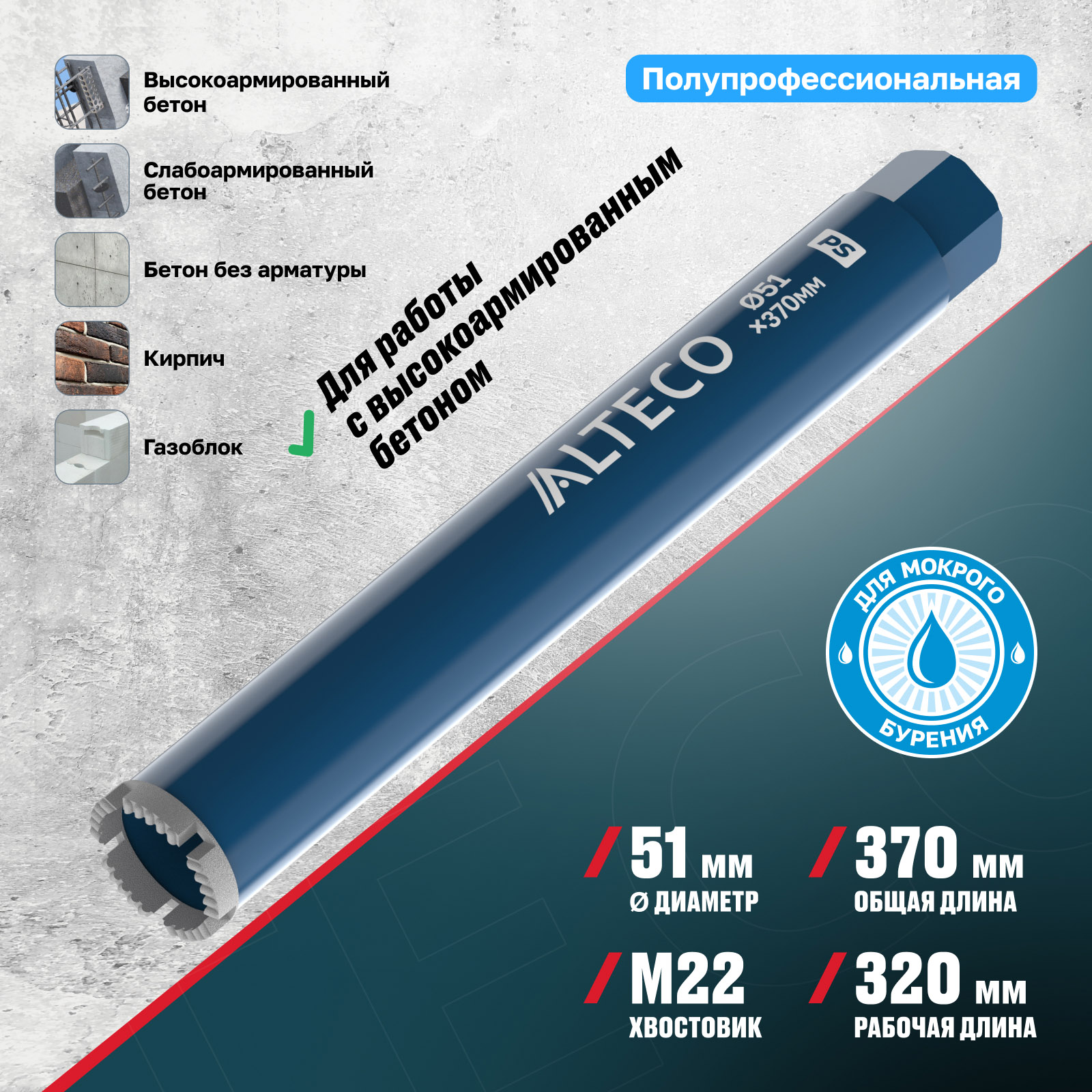 ⚠️ Важно: Данная коронка не предназначена для сухого бурения. Используйте охлаждение водой для продления срока службы инструмента и коронки. Не предназначена для работы с инструментом с микроударом.
