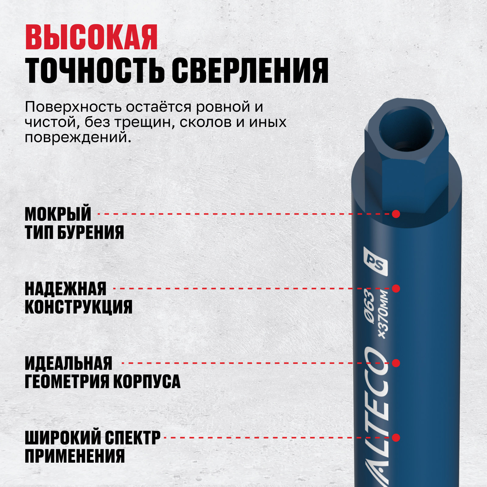 - Высокая точность сверления — поверхность остаётся ровной и чистой, без трещин, сколов и иных повреждений.