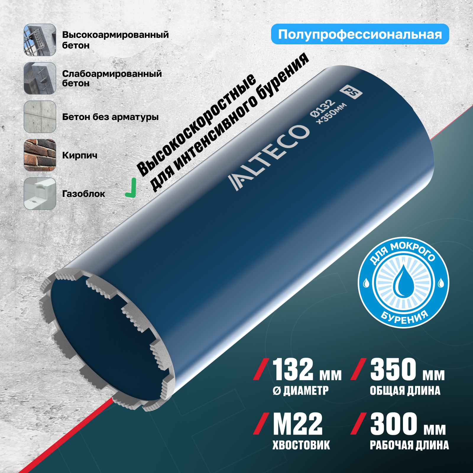 - Глубина сверления до 300 мм — позволяет проходить большинство стен и перекрытий за один заход без необходимости высверливать керн.