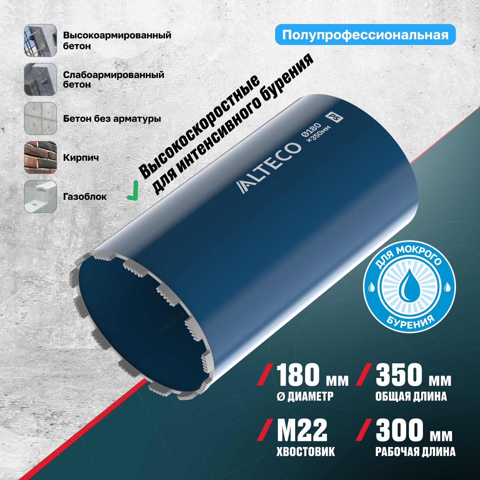 - Глубина сверления до 300 мм — позволяет проходить большинство стен и перекрытий за один заход без необходимости высверливать керн.