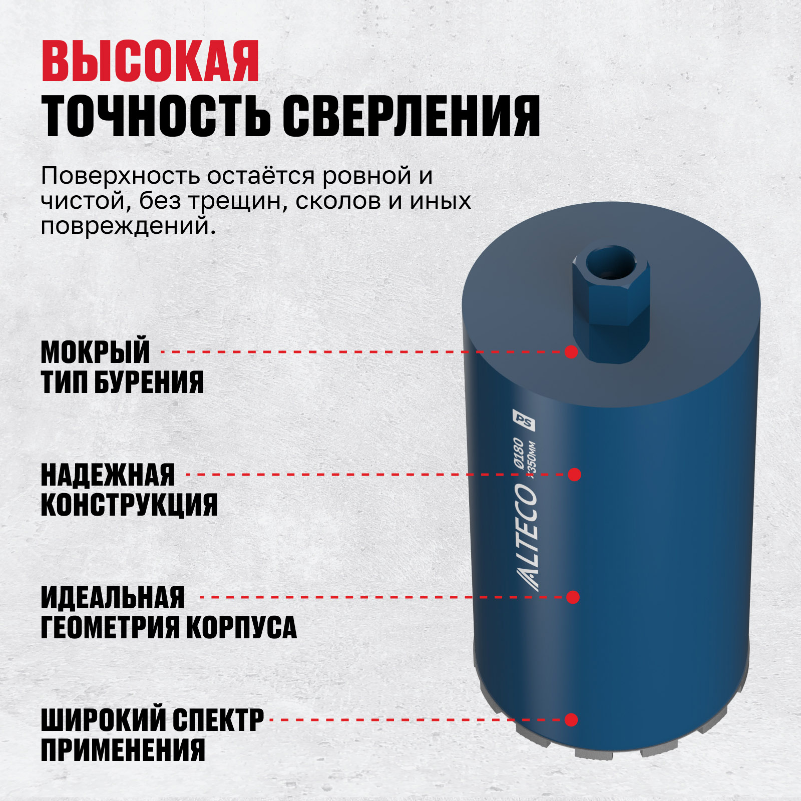 - Высокая точность сверления — поверхность остаётся ровной и чистой, без трещин, сколов и иных повреждений.