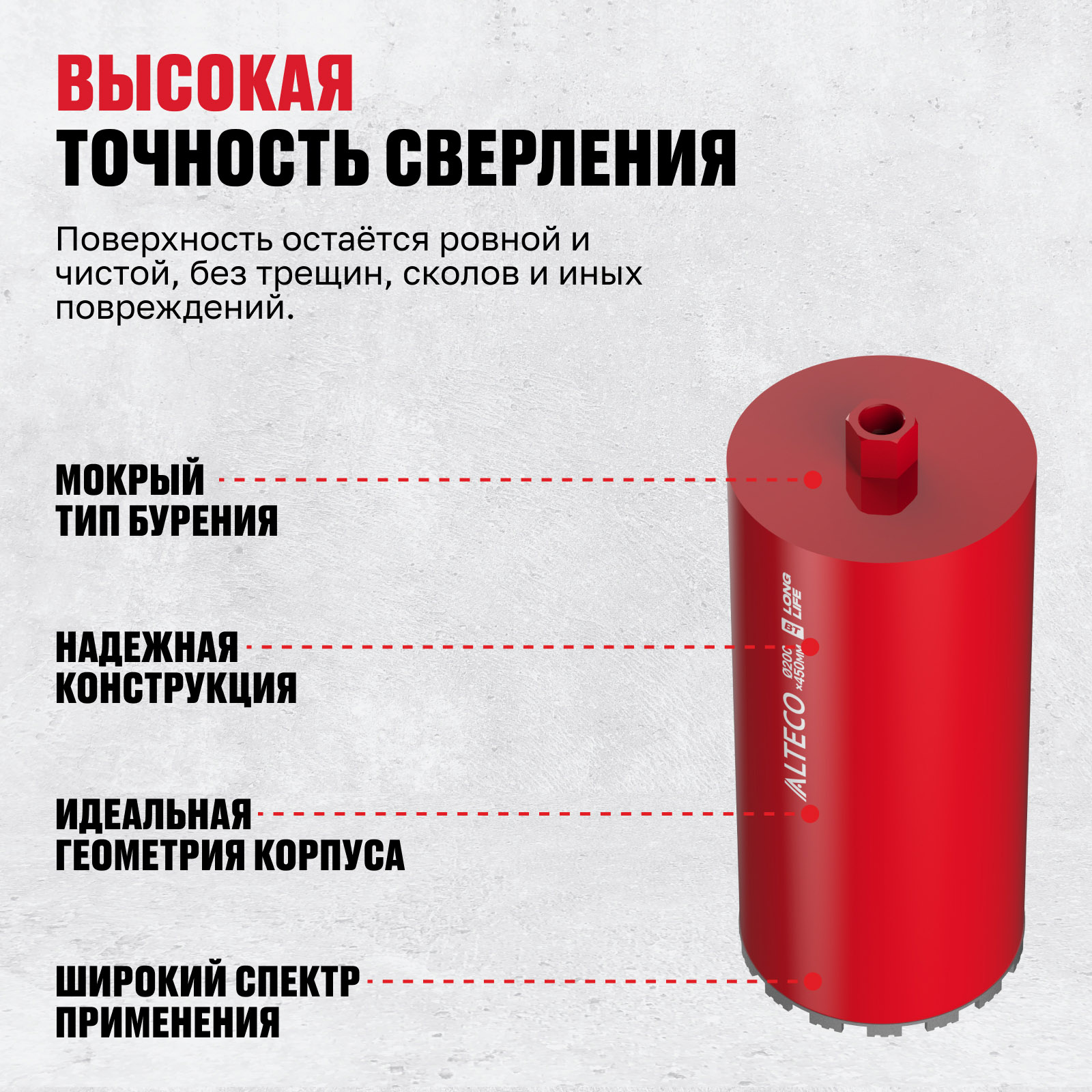 ⚠️ Важно: Данная коронка не предназначена для сухого бурения. Используйте охлаждение водой для продления срока службы инструмента и коронки. Не предназначена для работы с инструментом с микроударом.