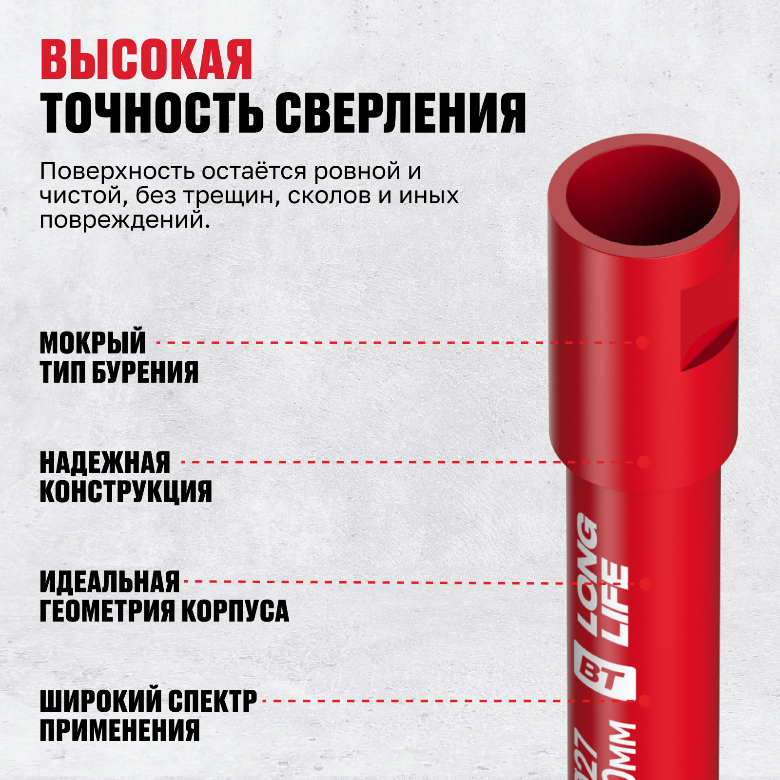 ⚠️ Важно: Данная коронка не предназначена для сухого бурения. Используйте охлаждение водой для продления срока службы инструмента и коронки. Не предназначена для работы с инструментом с микроударом.
