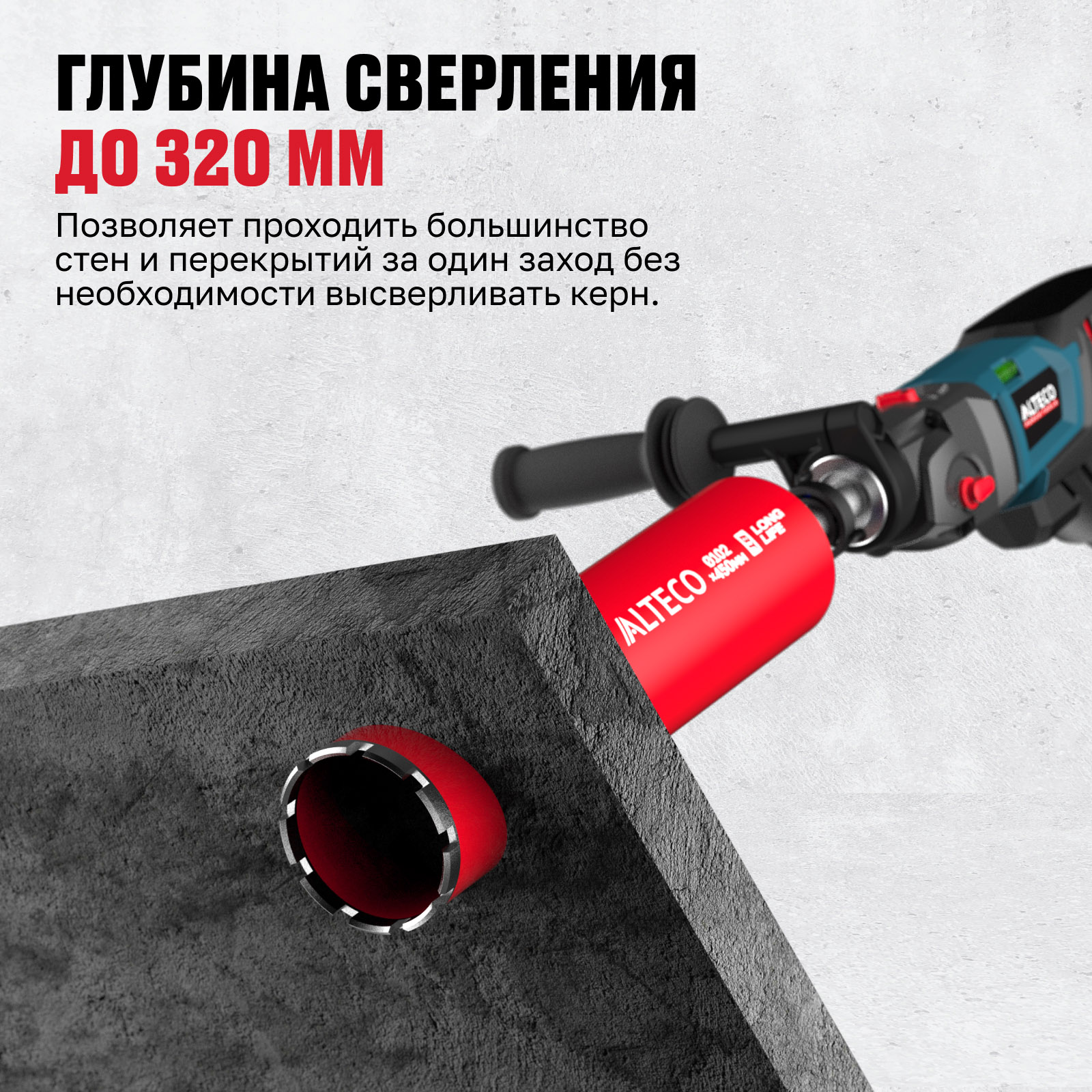 - Глубина сверления до 400 мм — позволяет проходить большинство стен и перекрытий за один заход без необходимости высверливать керн.