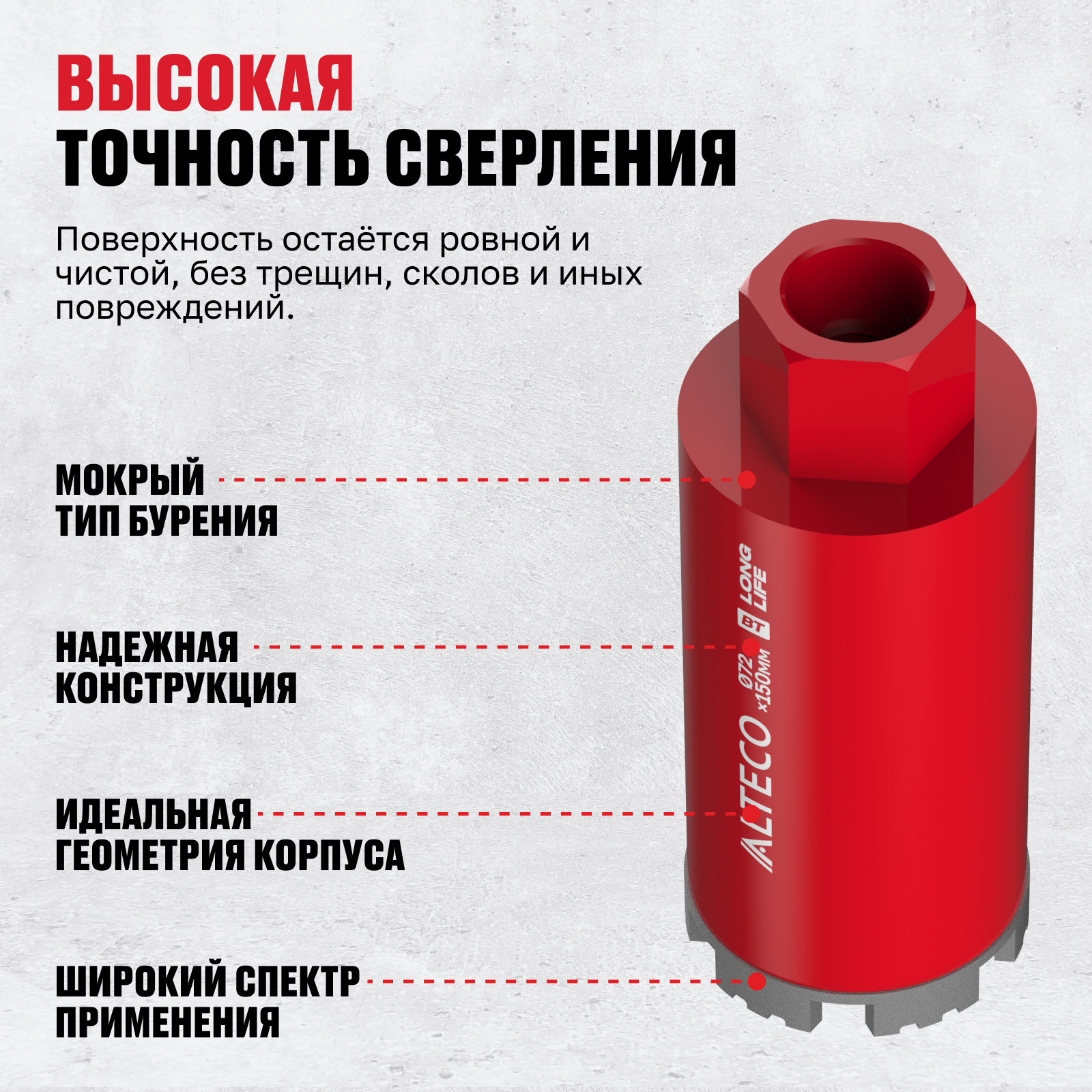 - Высокая точность сверления — поверхность остаётся ровной и чистой, без трещин, сколов и иных повреждений.