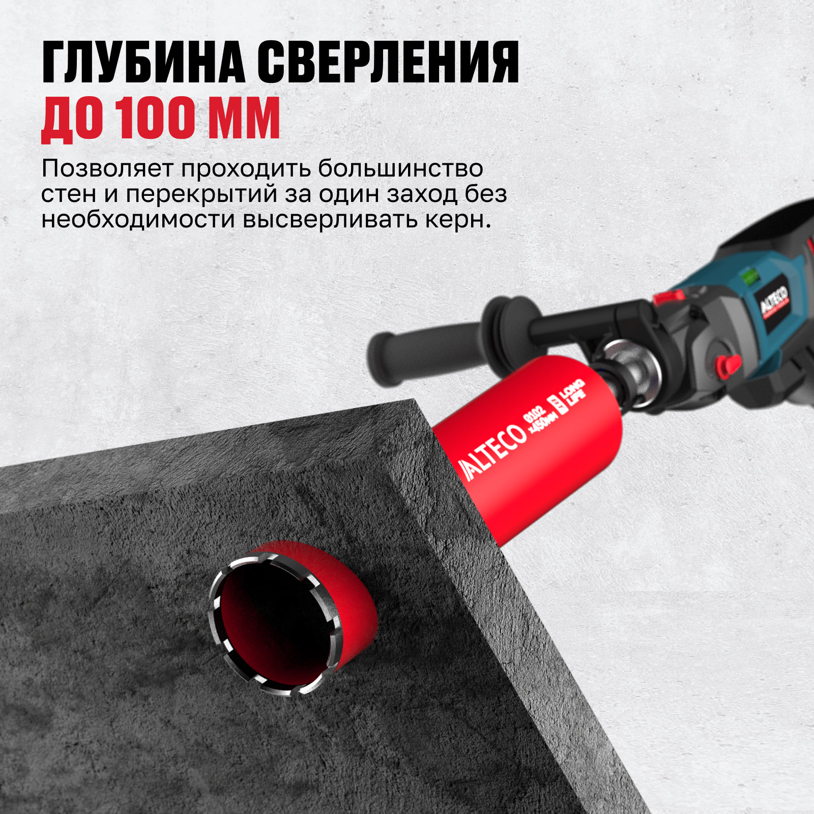 - Глубина сверления до 100 мм — позволяет проходить большинство стен и перекрытий за один заход без необходимости высверливать керн.