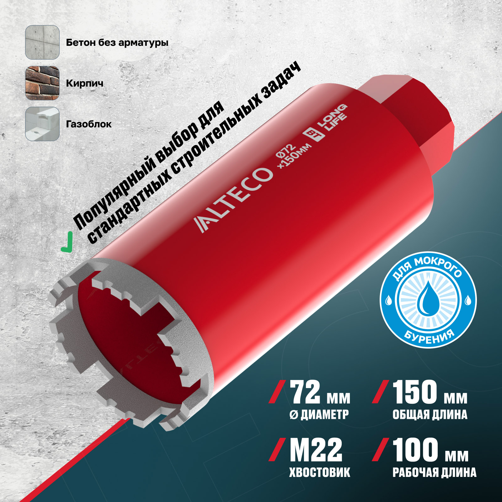 - Мокрый тип бурения — предотвращает перегрев и продлевает срок службы коронки.