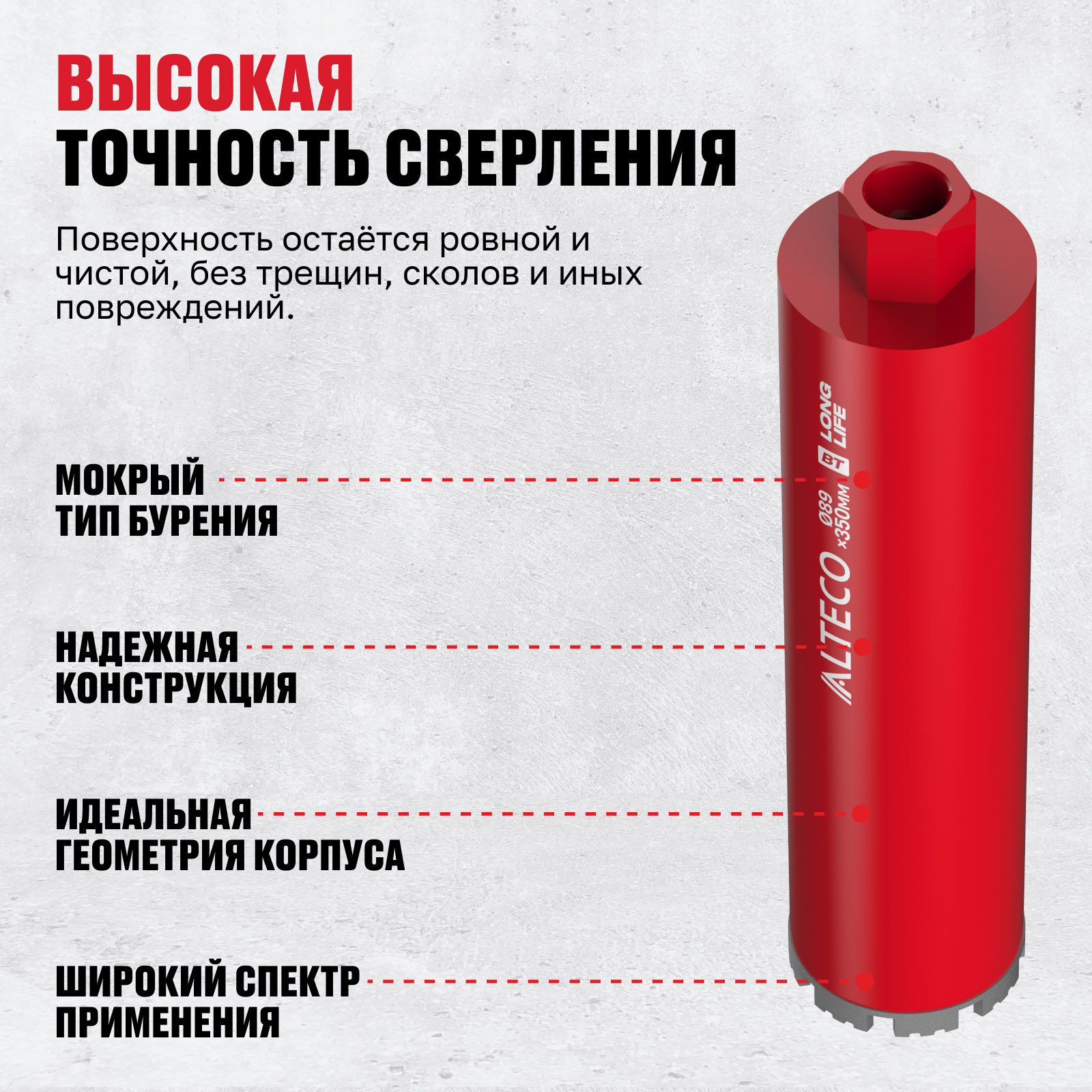 - Высокая точность сверления — поверхность остаётся ровной и чистой, без трещин, сколов и иных повреждений.