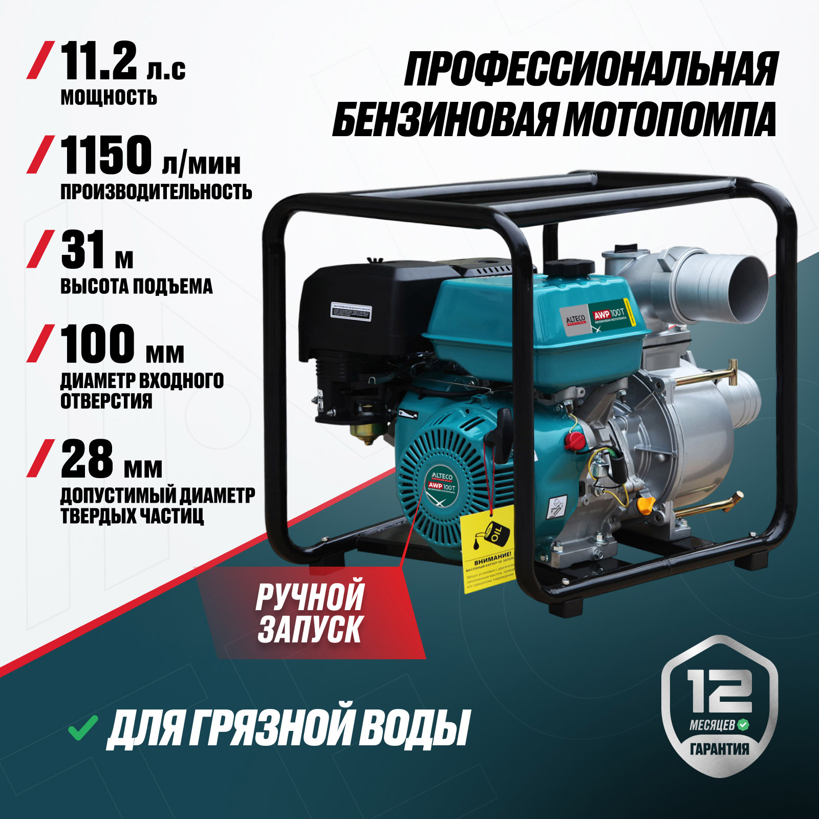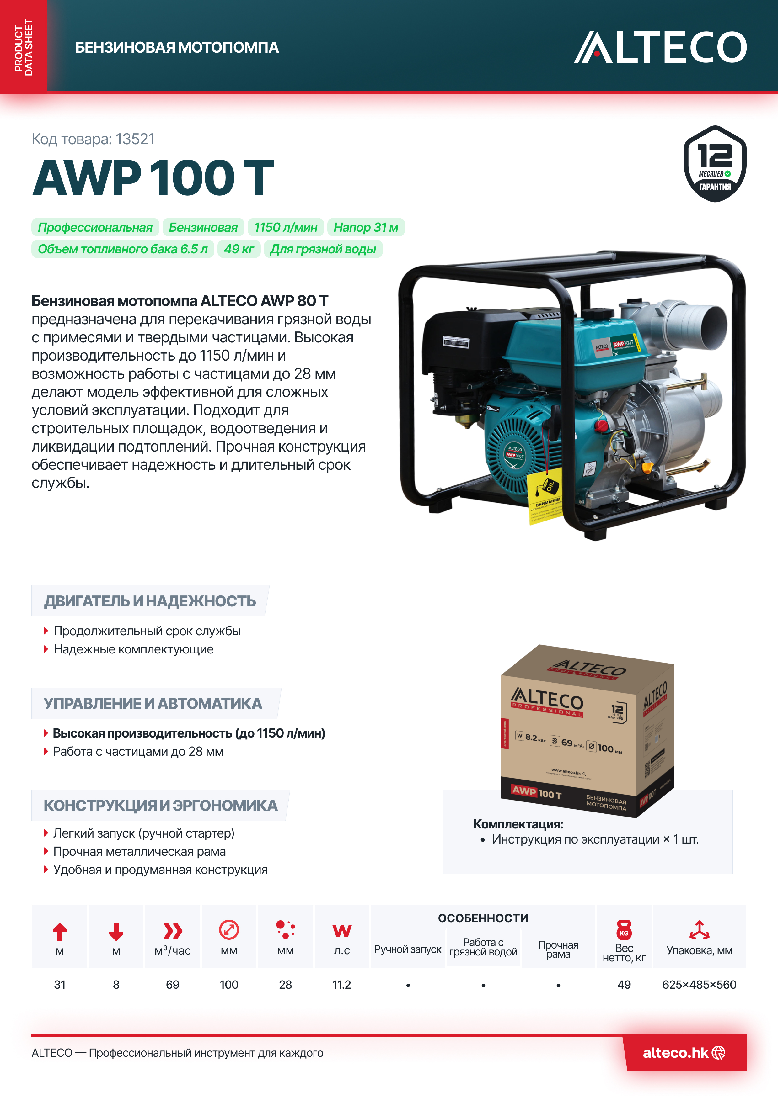 - Высокая производительность – обеспечивает перекачку воды до 1150 л/мин, позволяя быстро справляться с большими объемами работ.