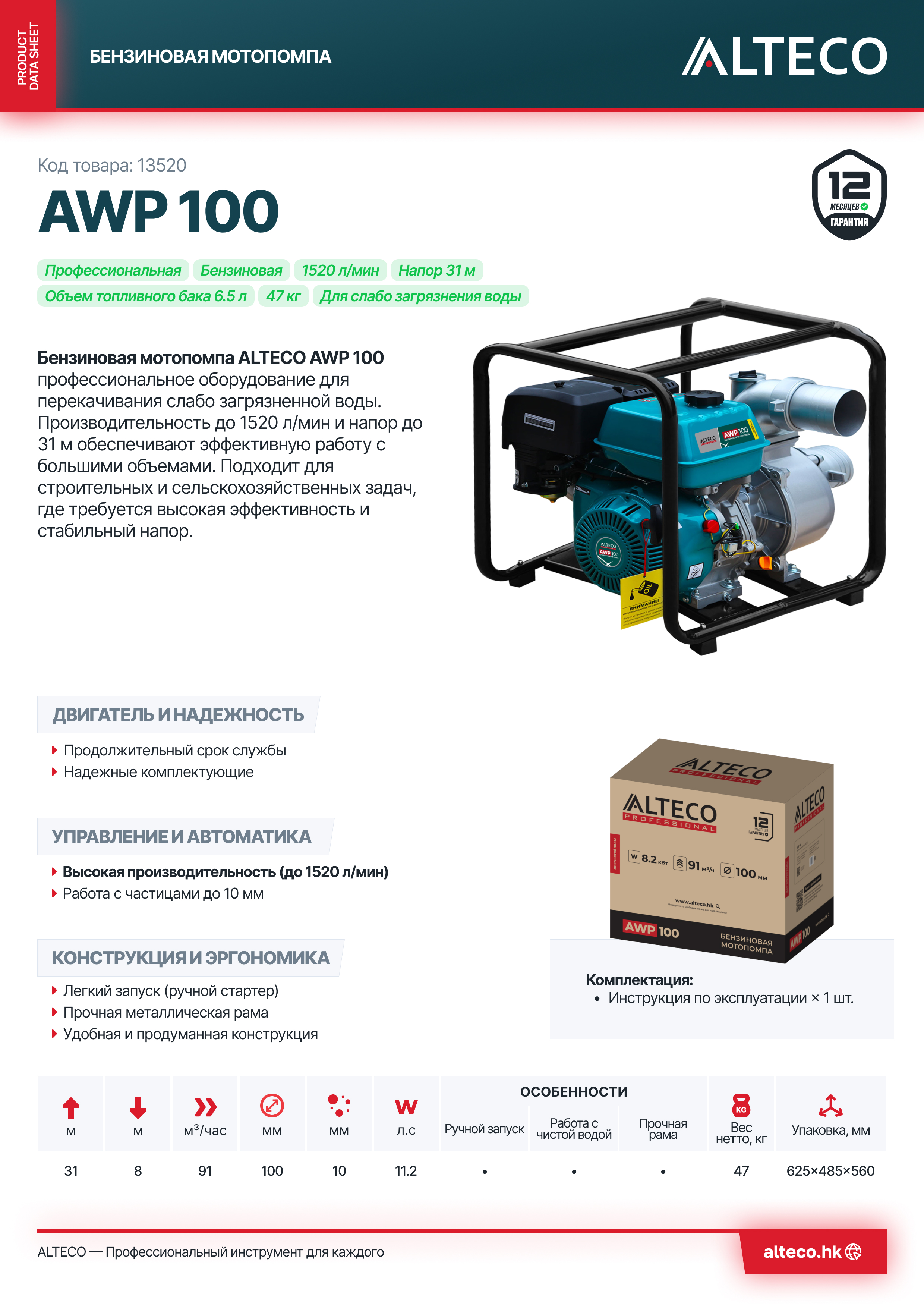 - Высокая производительность – обеспечивает перекачку воды до 1520 л/мин, позволяя быстро справляться с большими объемами работ.