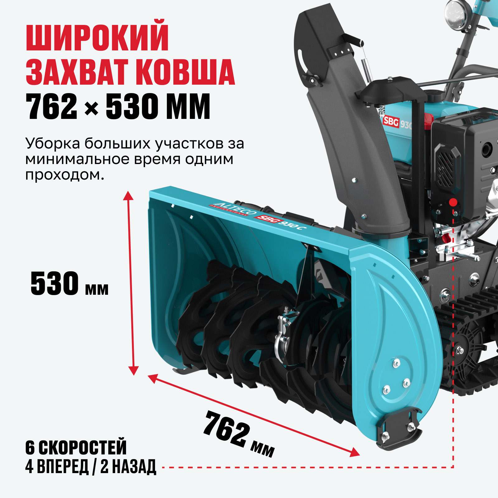 - Широкий захват ковша 762 × 530 мм — уборка больших участков за минимальное время одним проходом.