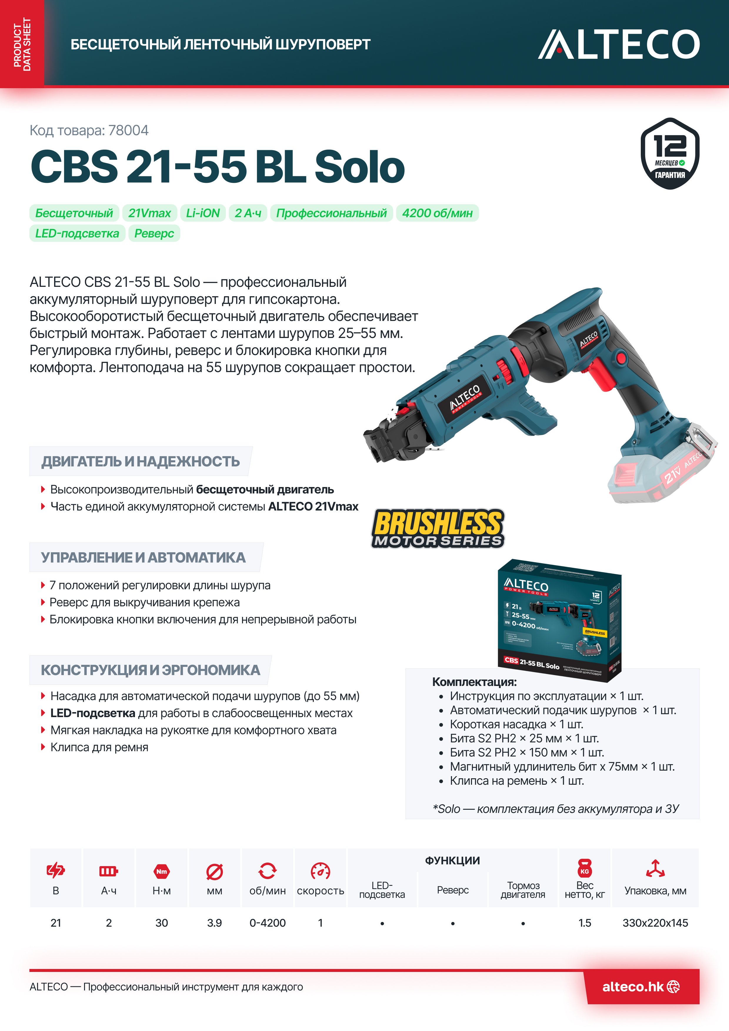 - Часть единой аккумуляторной системы ALTECO 21Vmax — один аккумулятор подходит для всех инструментов этой серии, обеспечивая удобство, экономию и гибкость в работе.