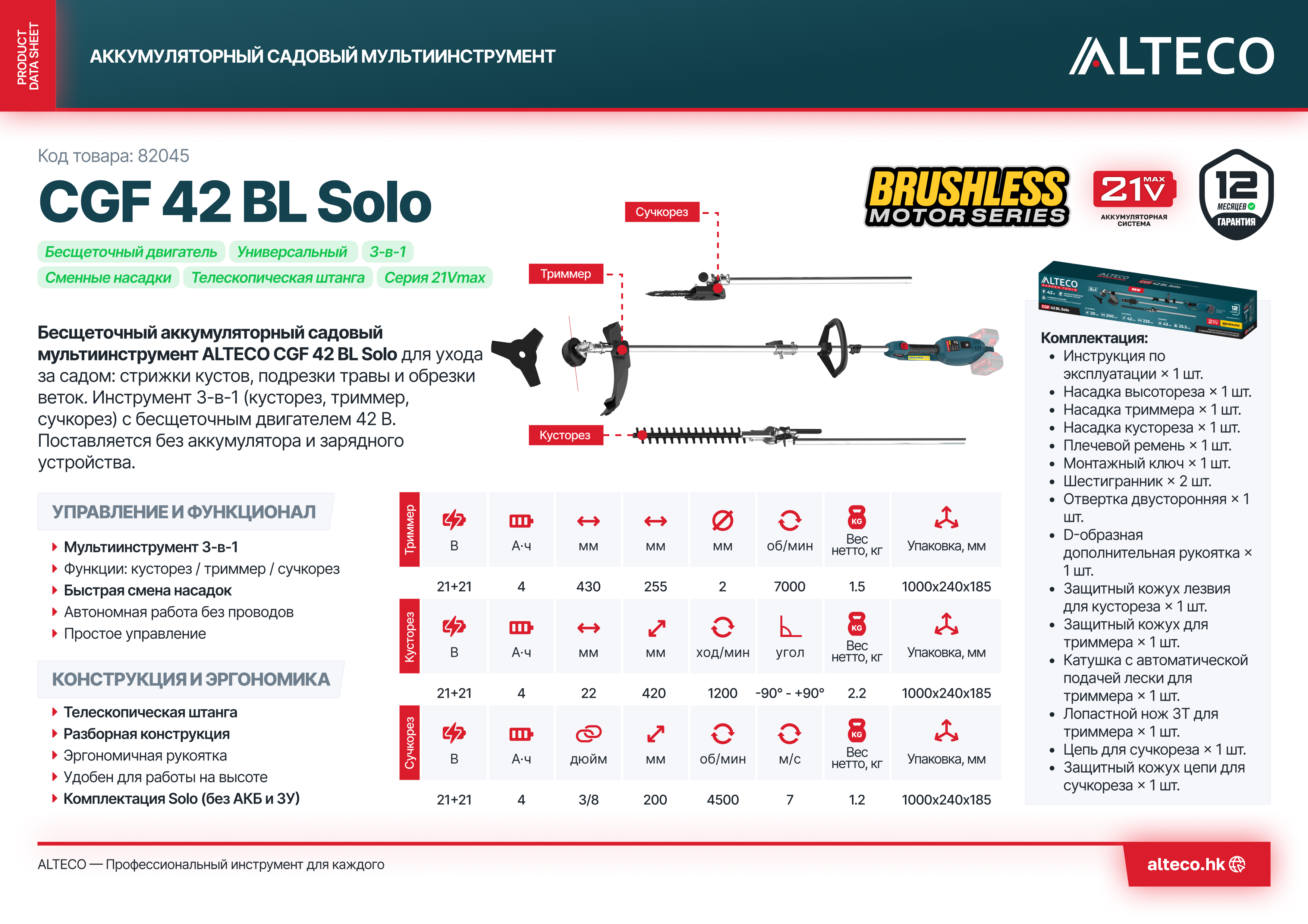- Часть единой аккумуляторной системы ALTECO 21Vmax — один аккумулятор подходит для всех инструментов этой серии, обеспечивая удобство, экономию и гибкость в работе.