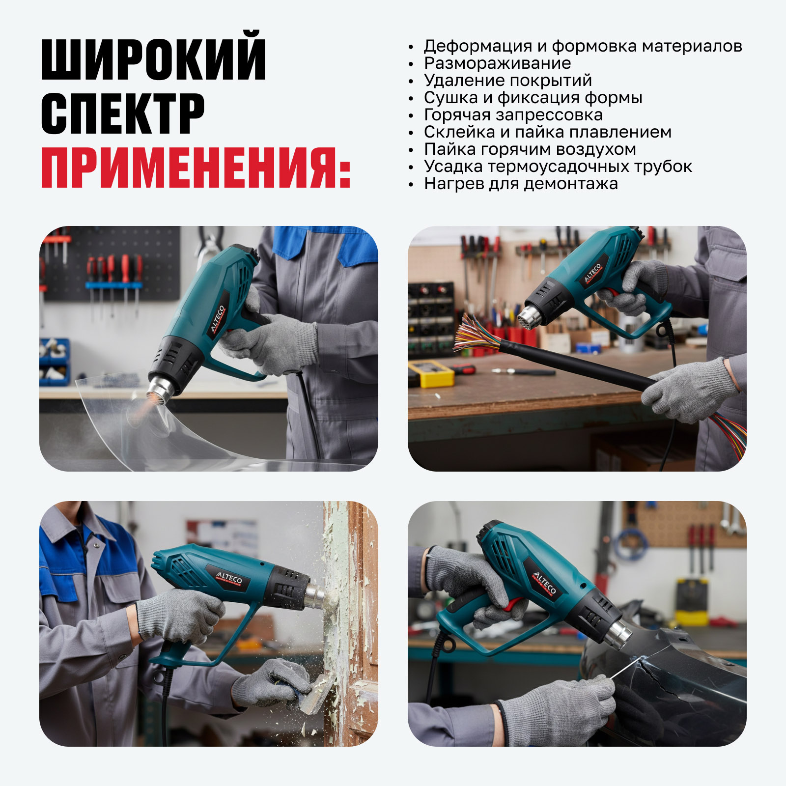 - Деформация и формовка материалов — нагрев для изгиба и придания формы пластику и ПВХ.