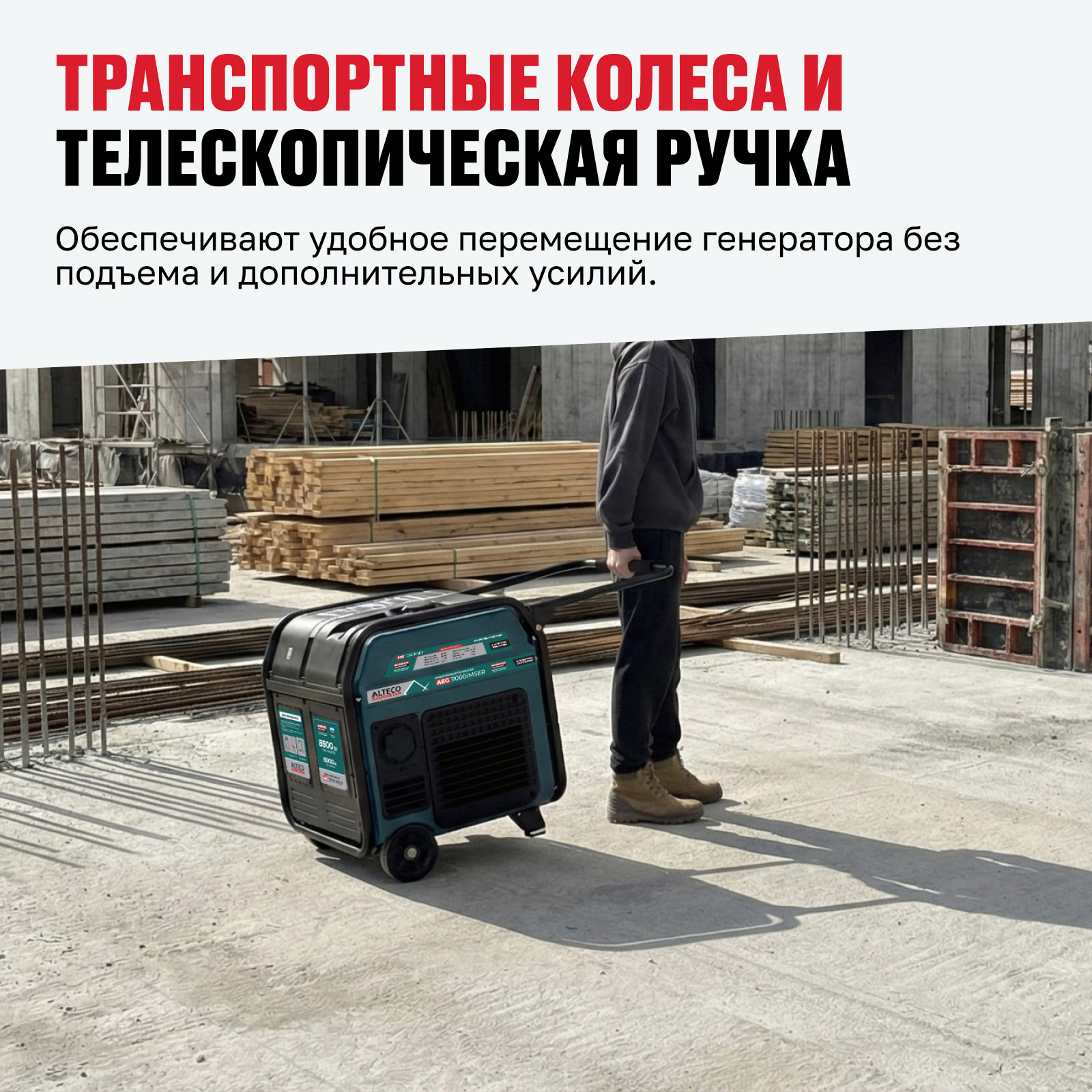 - Транспортные колеса и телескопическая ручка — обеспечивают удобное перемещение генератора без подъема и дополнительных усилий.