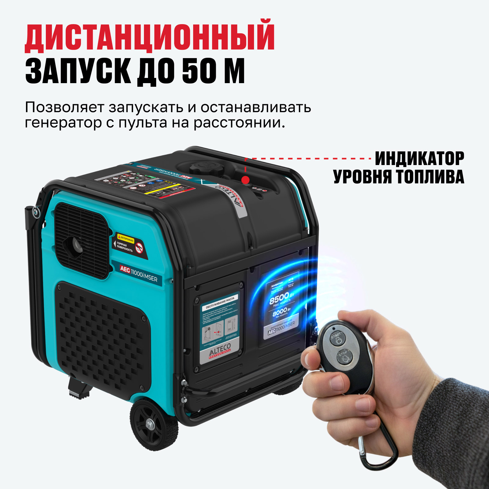 - Дистанционный запуск до 50 м — позволяет запускать и останавливать генератор с пульта на расстоянии.