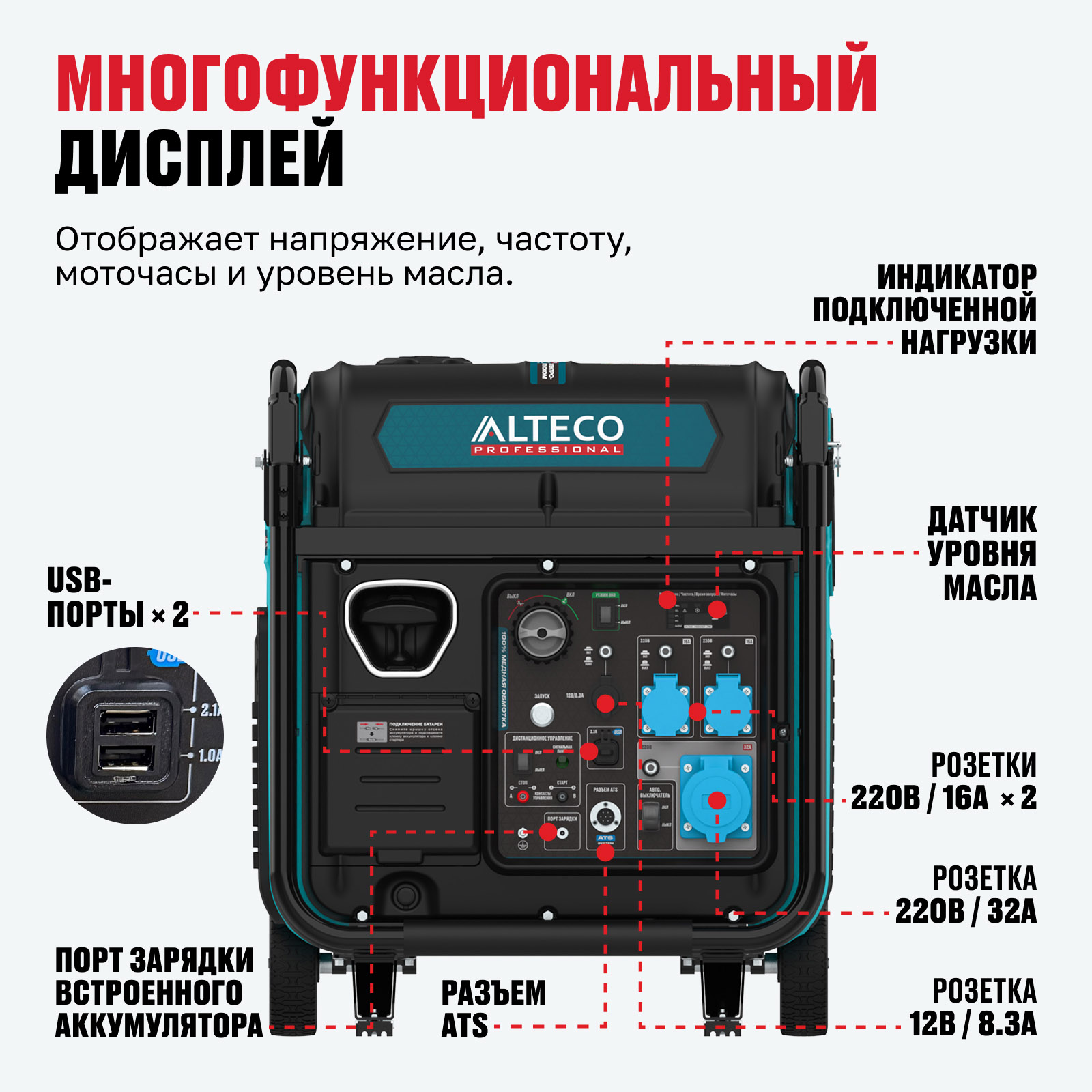 - Порт зарядки встроенного аккумулятора — упрощает обслуживание и поддерживает готовность генератора к работе.