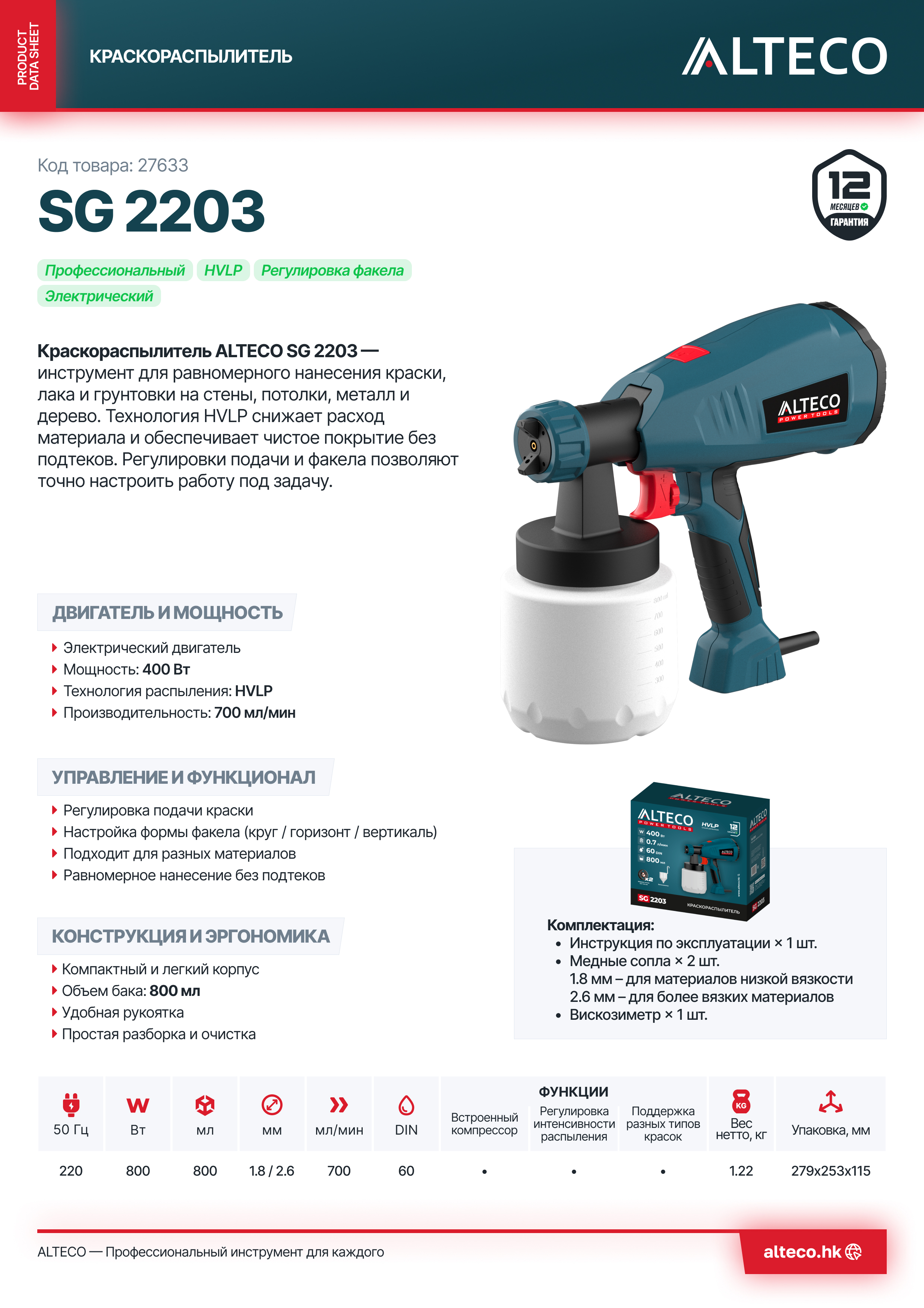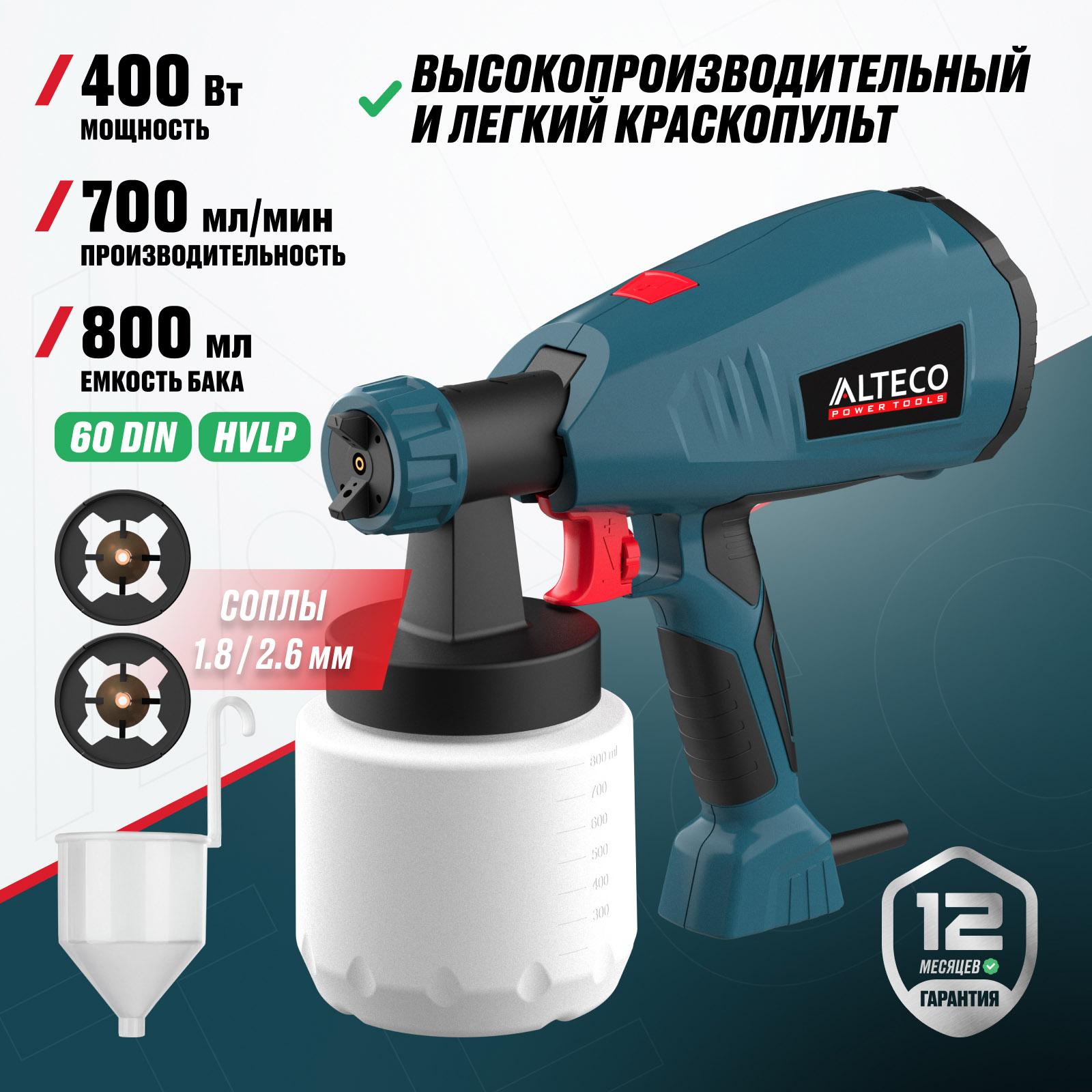 - Технология HVLP — экономичное распыление с минимальными потерями материала и аккуратным покрытием без подтеков.