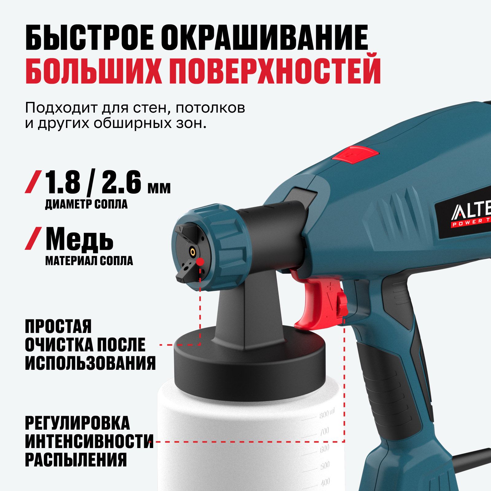 - Производительность 700 мл/мин — обеспечивает быстрый и равномерный перенос краски, сокращая время выполнения работ.