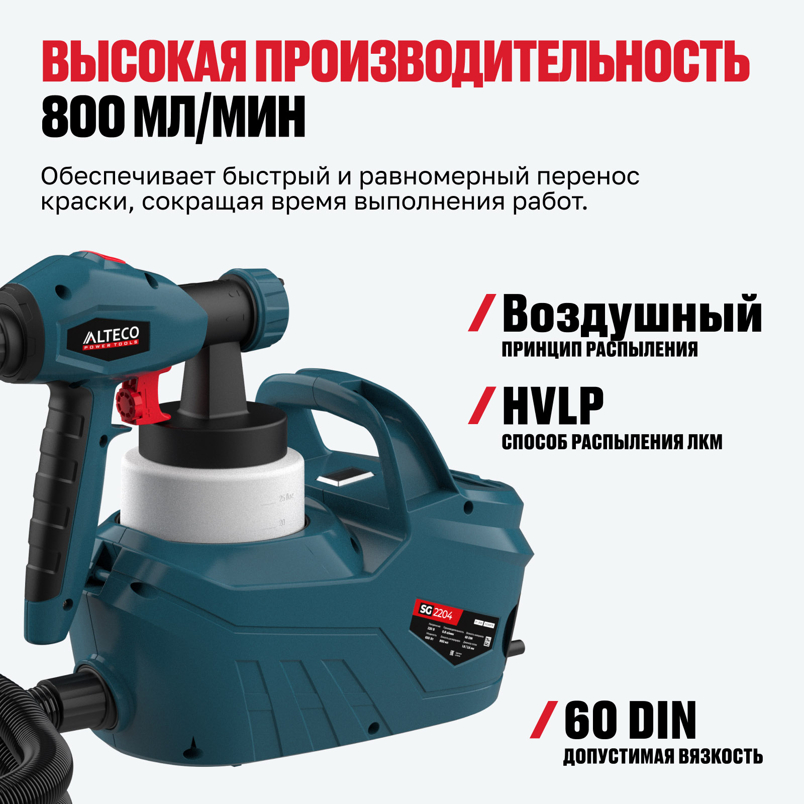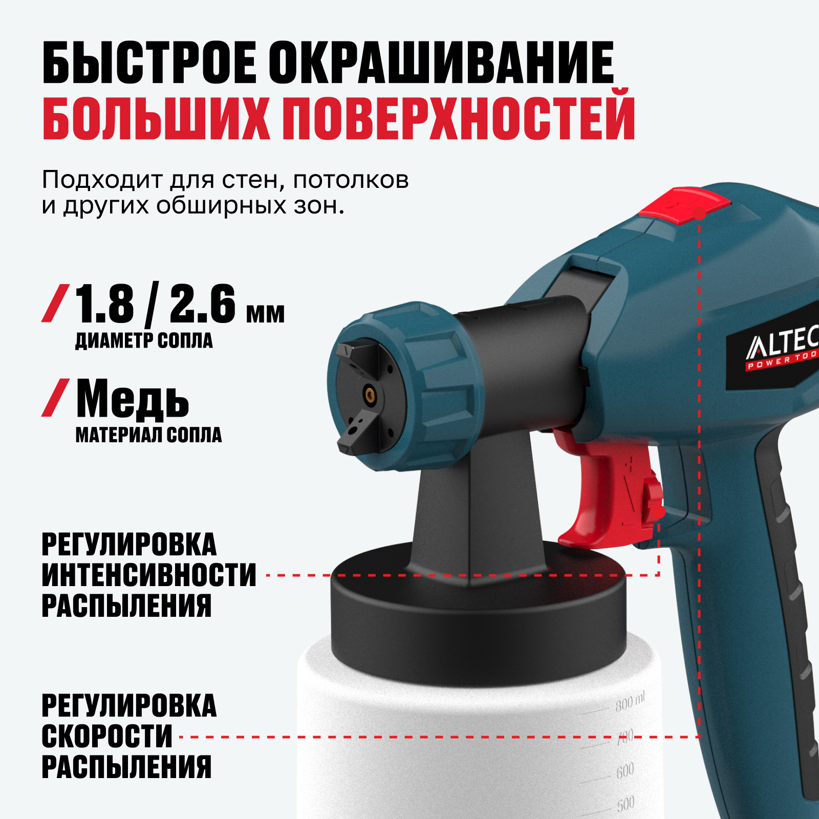 - Производительность 800 мл/мин — обеспечивает быстрый и равномерный перенос краски, сокращая время выполнения работ.