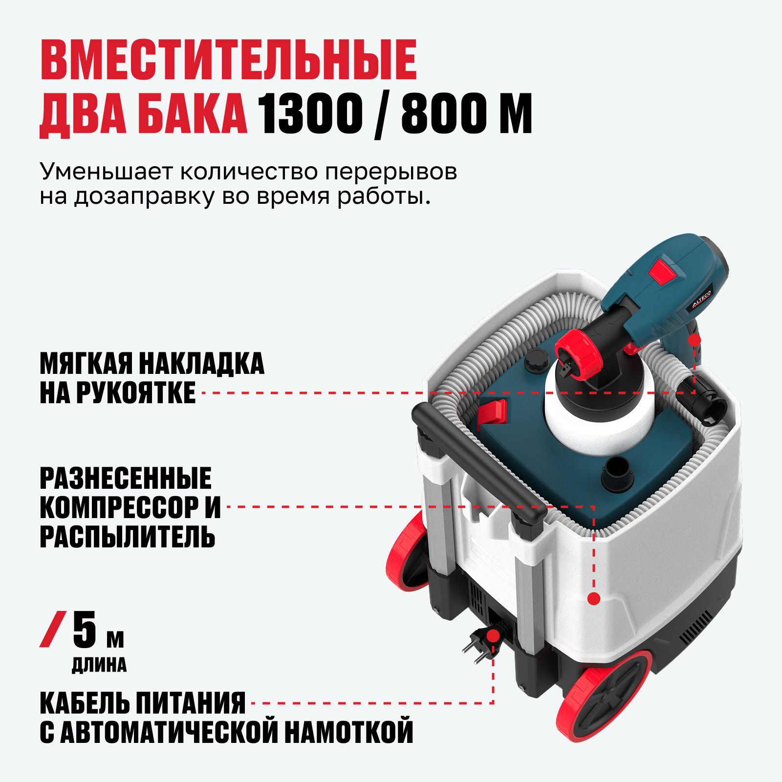 - Вместительные два бака 1300 и 800 мл — уменьшает количество перерывов на дозаправку во время работы.