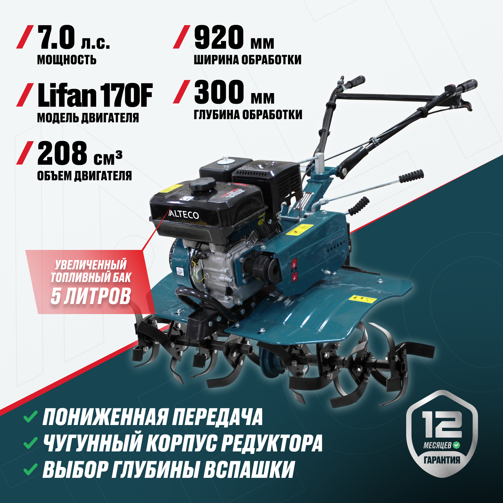- Пониженная передача - обеспечивает повышенную тяговую мощность для работы на тяжелых грунтах и при вспашке сложных участков