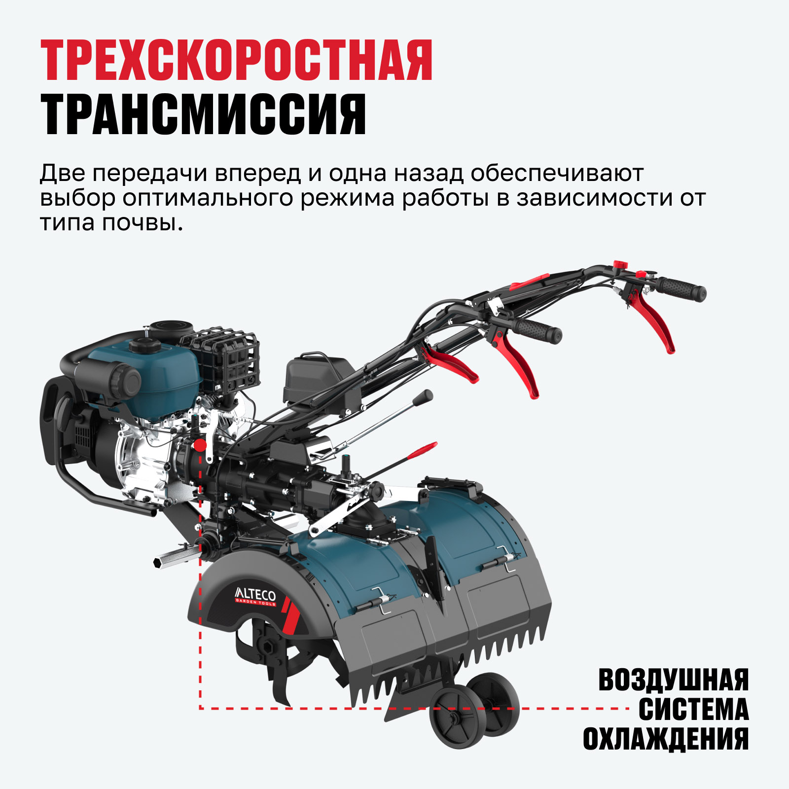 - Трехскоростная трансмиссия — две передачи вперед и одна назад обеспечивают выбор оптимального режима работы в зависимости от типа почвы.