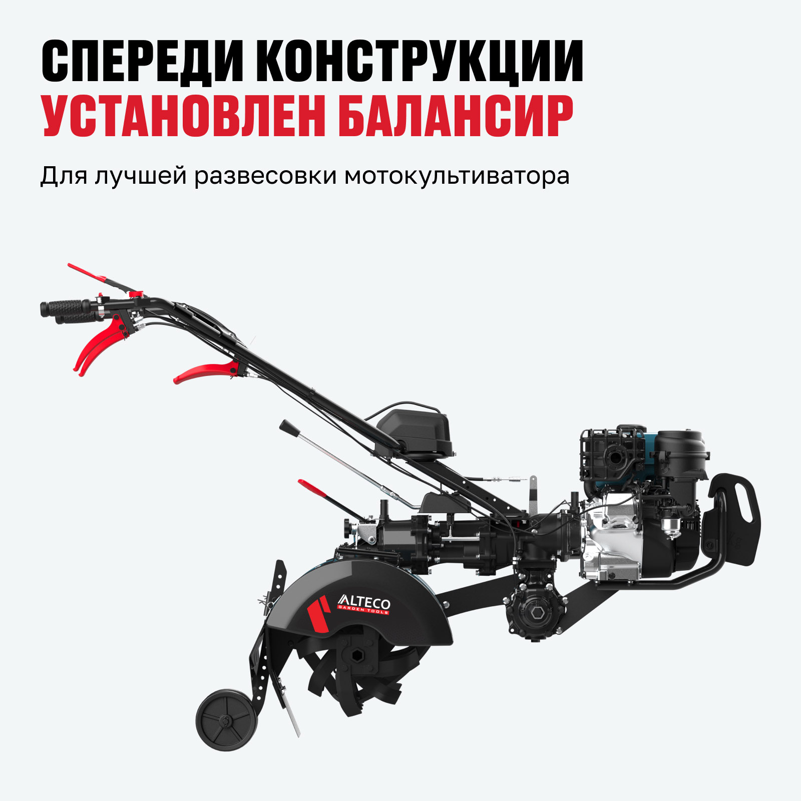 - Спереди конструкции установлен балансир — для лучшей развесовки мотокультиватора