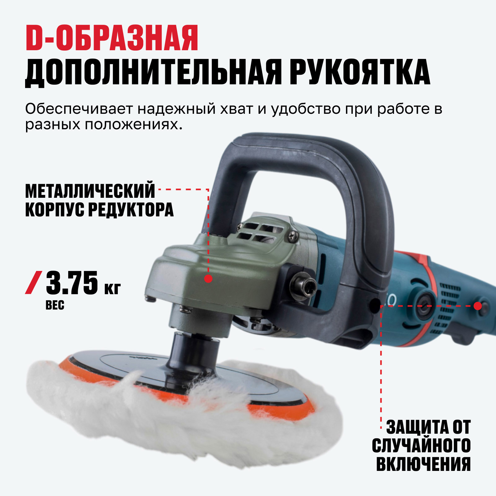 - D-образная дополнительная рукоятка — обеспечивает надежный хват и удобство при работе в разных положениях.
