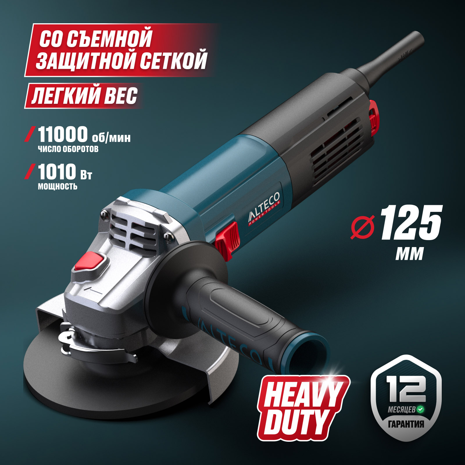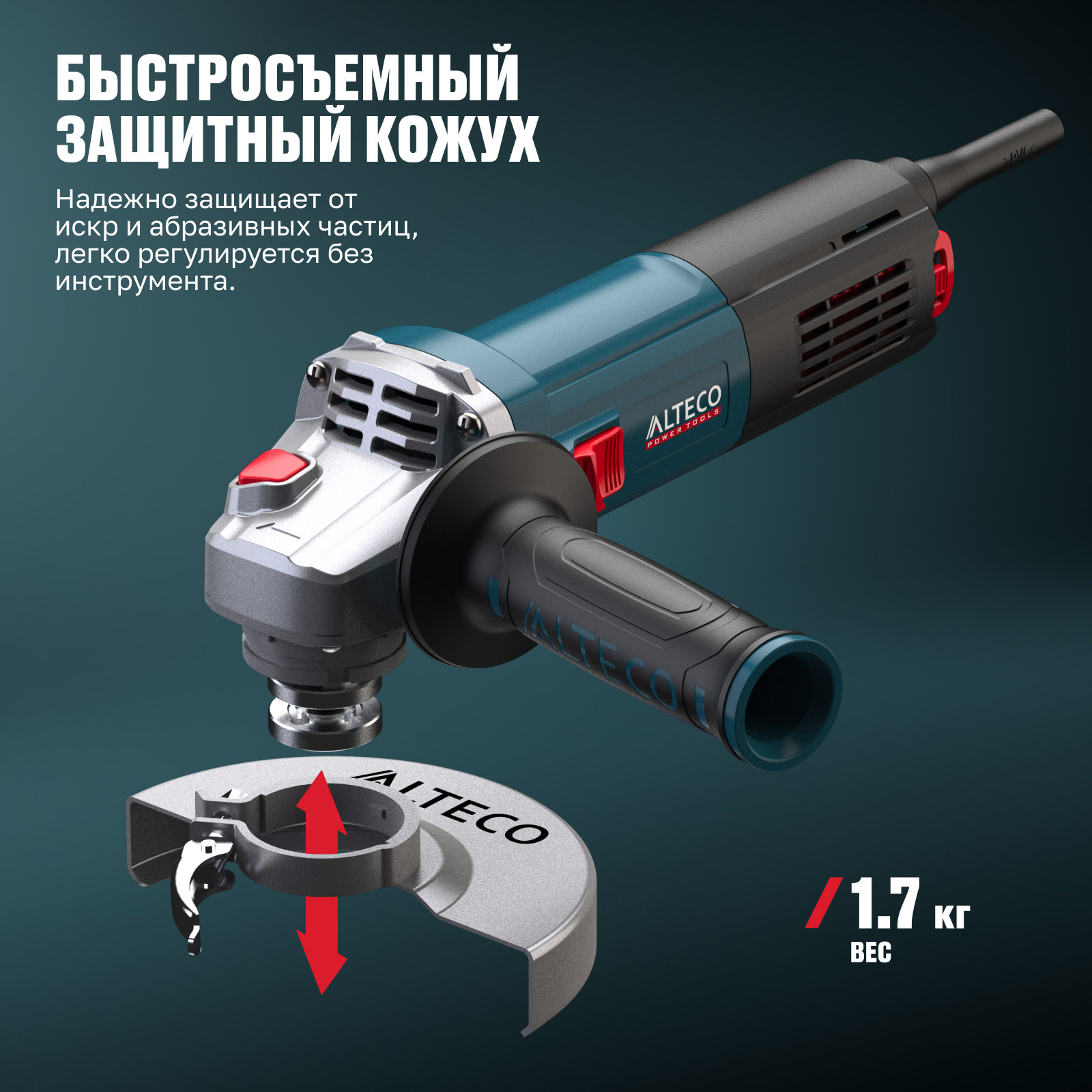 - Быстросъемный защитный кожух — надёжно защищает от искр и абразивных частиц, легко регулируется без инструмента.