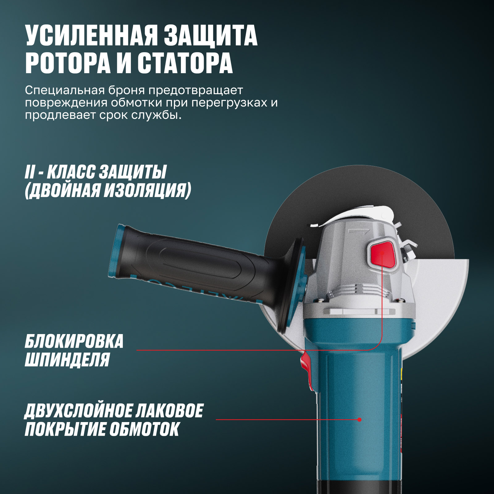 - Усиленная защита ротора и статора — специальная броня предотвращает повреждения обмотки при перегрузках и продлевает срок службы.